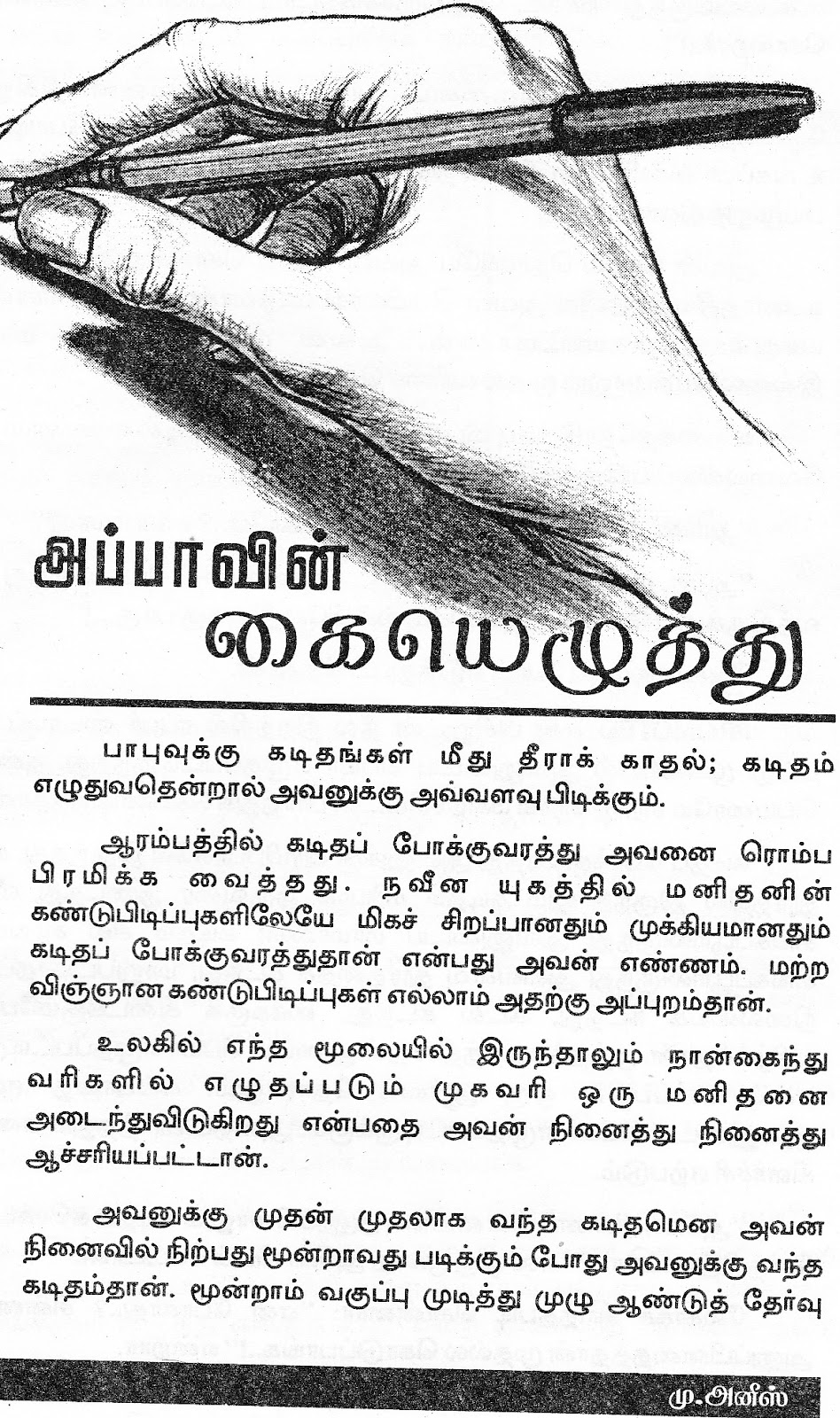 குறிப்பு: இச்சிறு கதையை படிக்கும் போது,கண்கள் நீரைச் சொரிந்தன.பள்ளி மற்றும் கல்லூரி நாட்களில்,நண்பர்களுக்கு கடிதம் எழுதியதை அப்படியே,படம் பிடித்து காட்டியது.